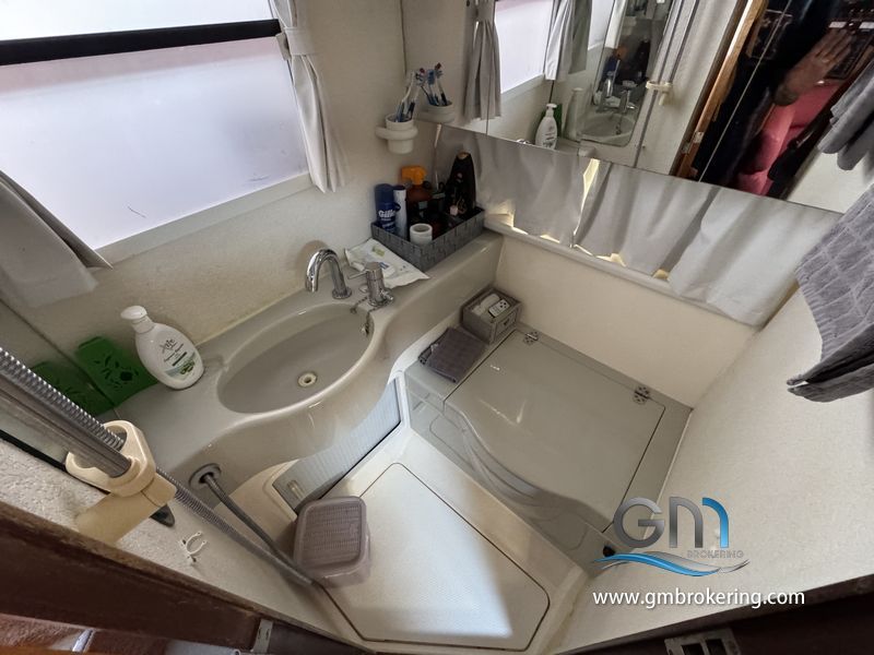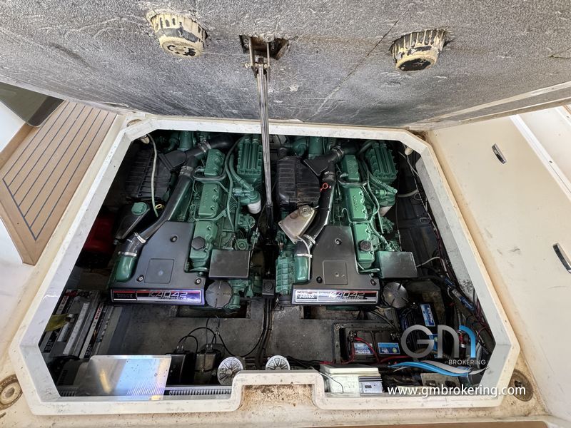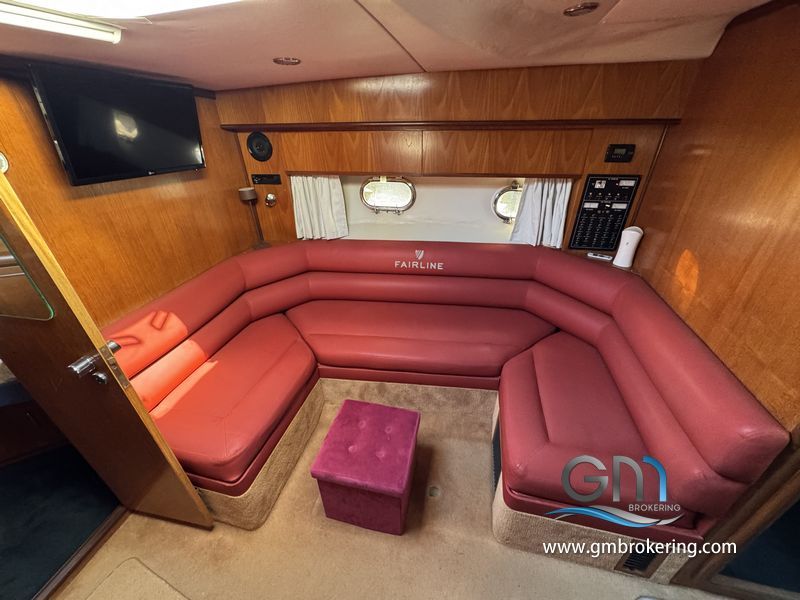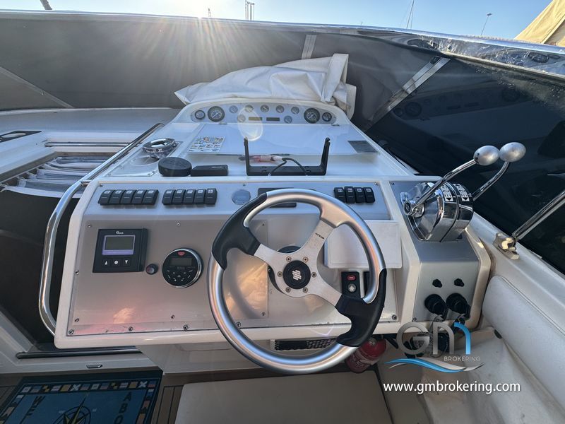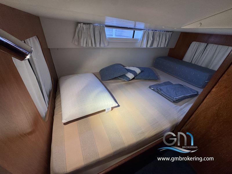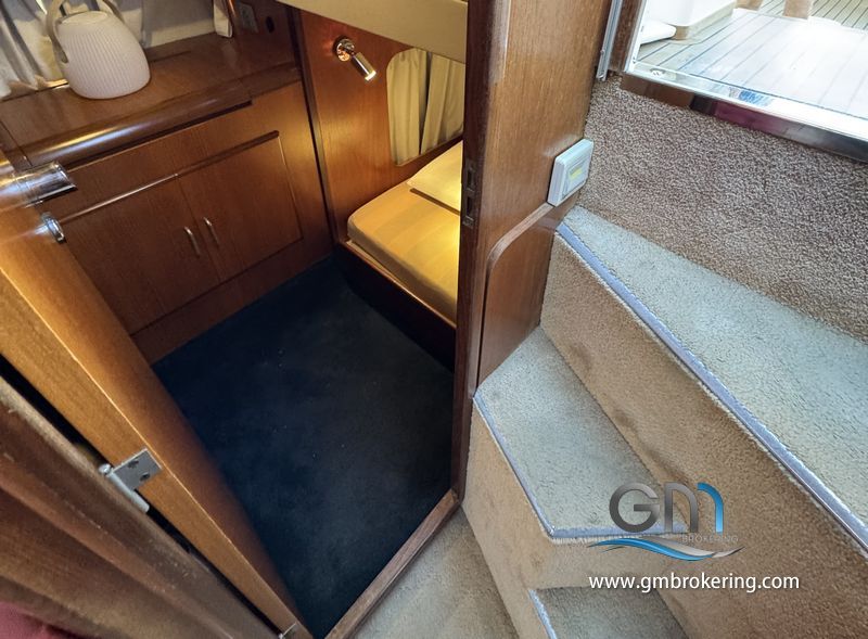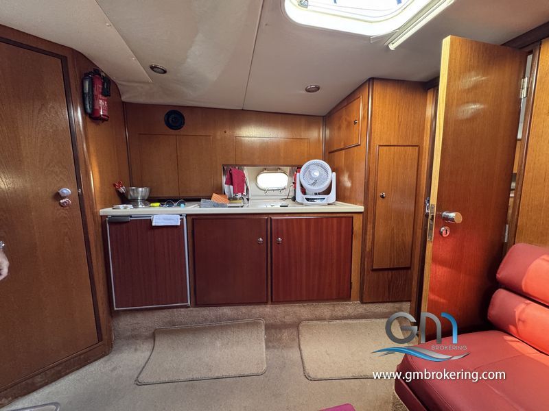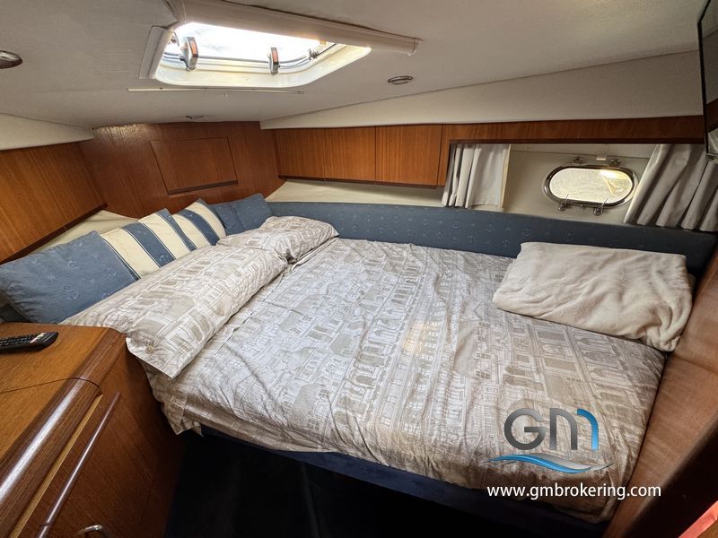 Gli interni sono sono caratterizzati da moquette sul caplestio, un divano ad angolo trasfromabile in un letto matrimoniale, cucina a gas con frigo e lavello, bagno separato con wc elettrico e doccia, cabina armatoriale di prua comunicante al bagno di servizio, cabina ospiti in poppa ubicata sul lato DX subito scendendo le scale in dinette.
